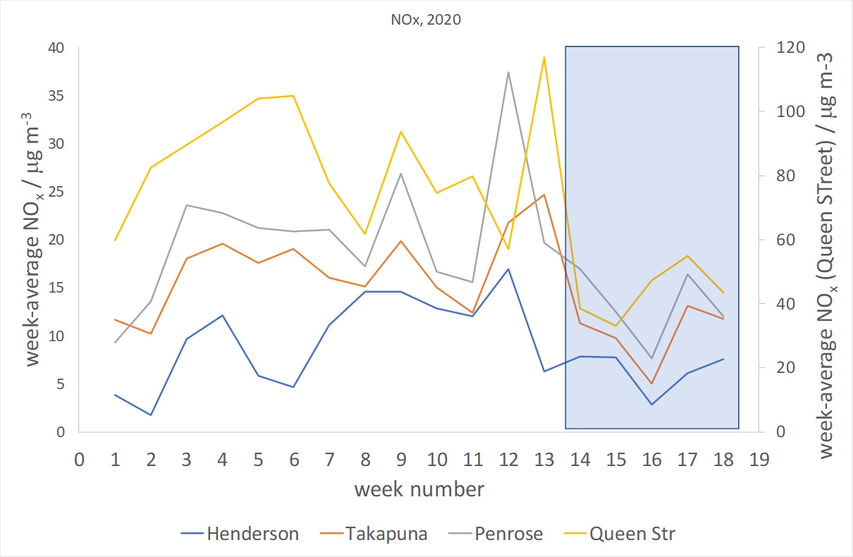 Figure 1: Weekly average NOx concentration at 4 Auckland sites. Shaded area is level-4 lockdown.