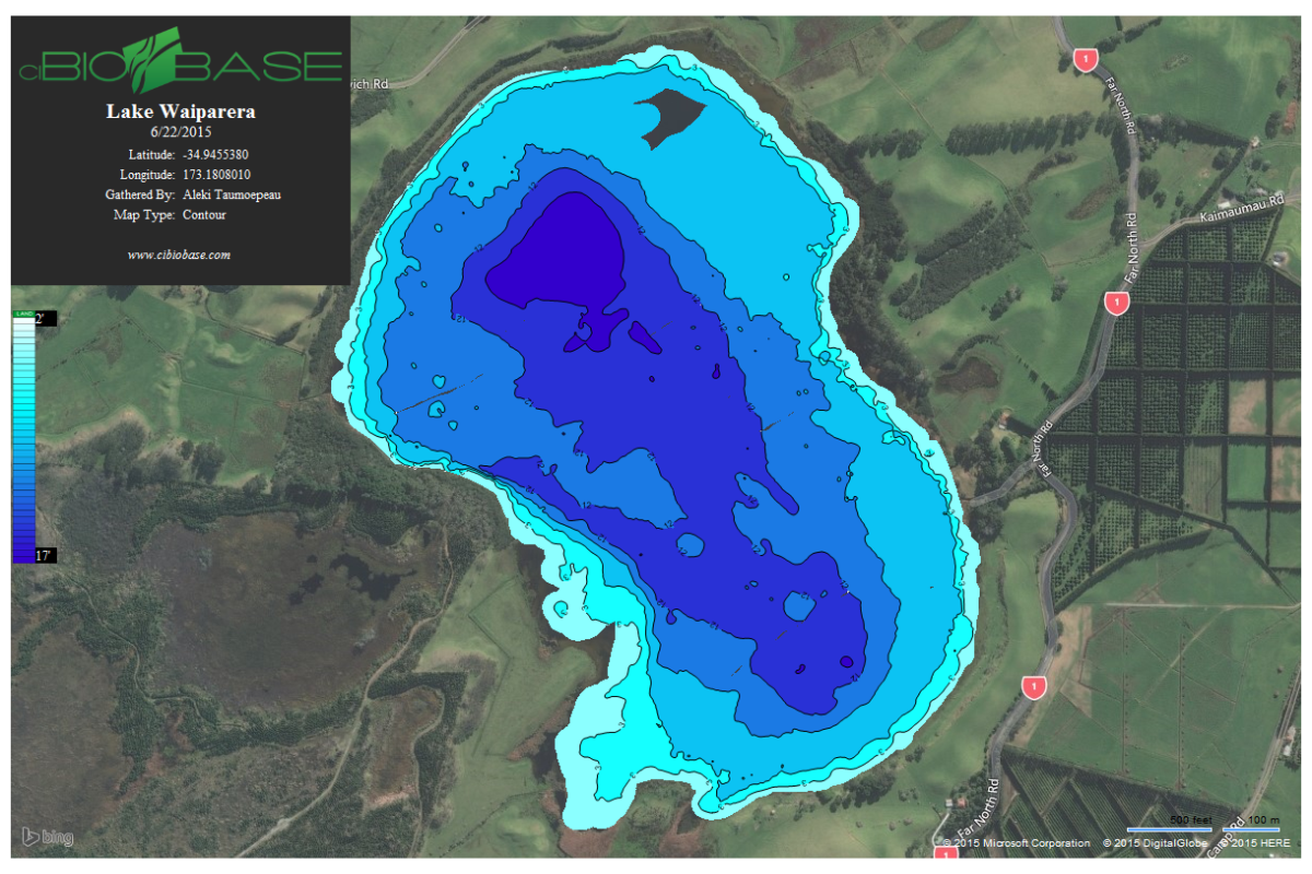 Figure 2. Hydro-acoustic produced maps of bathymetry in a Northland Lake (Lake Waiparera).
