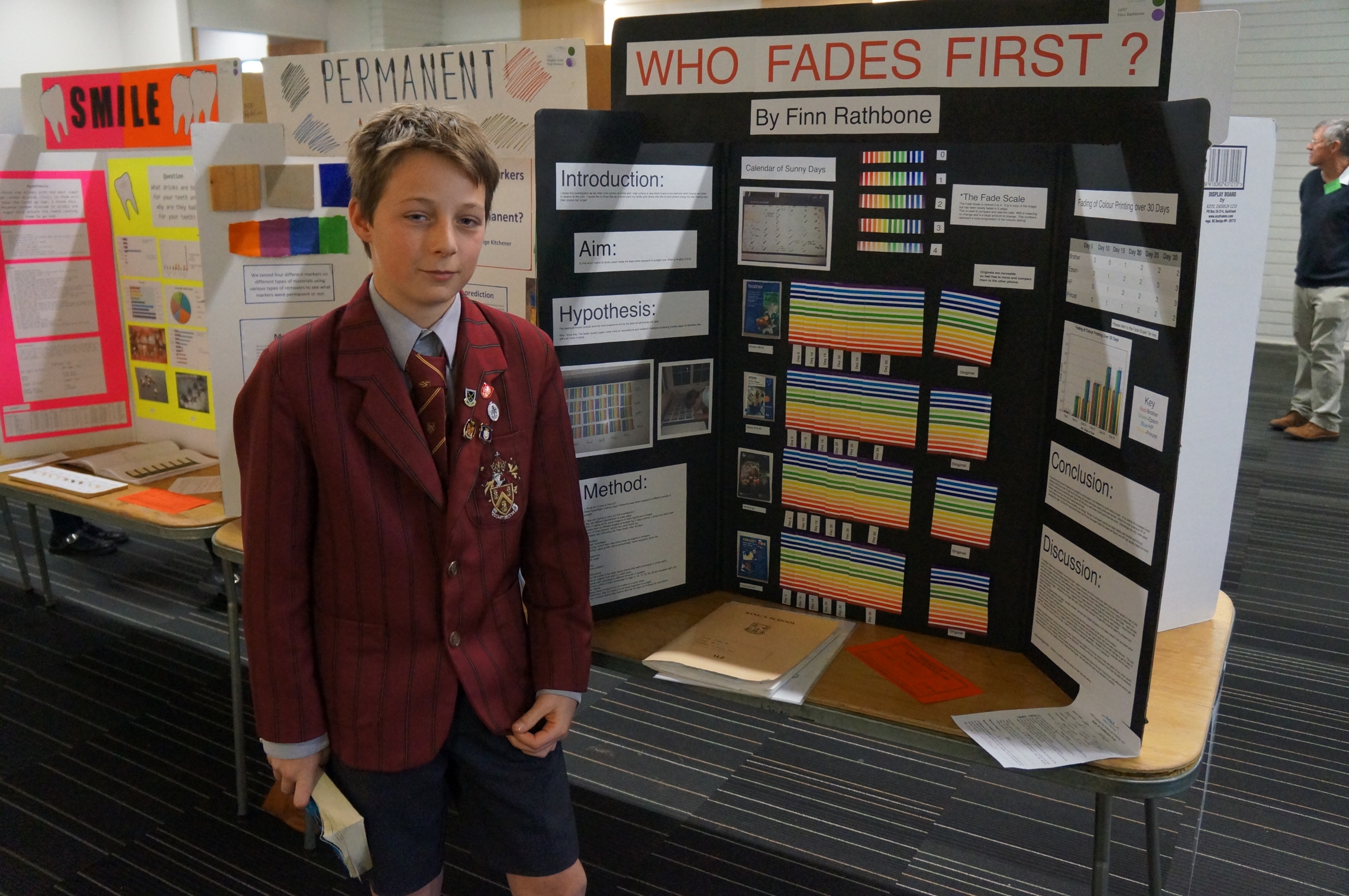 Finn with his project:Who fades first? He tested which brand of photo paper fades the least when exposed to sunlight over different lengths of time.