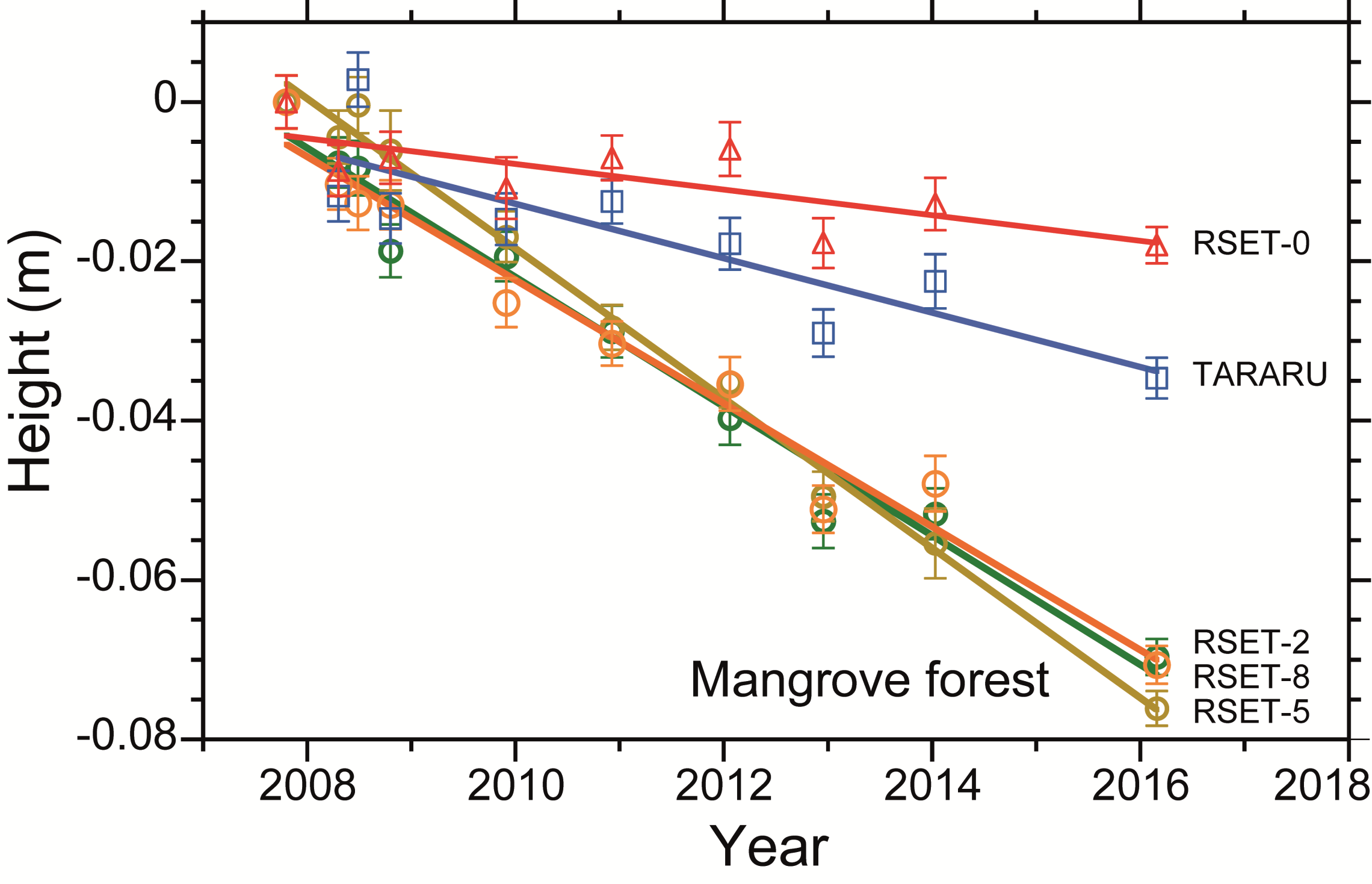 Figure 3: Firth of Thames RSET benchmarks - relative vertical trends with linear-regression fits for the mangrove-forest Rod Surface Elevation Tables (RSET-2, -5, -8), reference site RSET-0 and the Tararu tide gauge (October 2007 to February 2016). Precision values are shown as 95% confidence intervals
