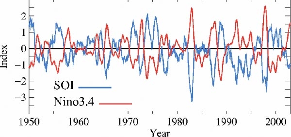 Five-month running mean of Southern Oscillation Index (SOI) and Nino3.4 SST anomaly, Jan-1950 to Dec-2002.