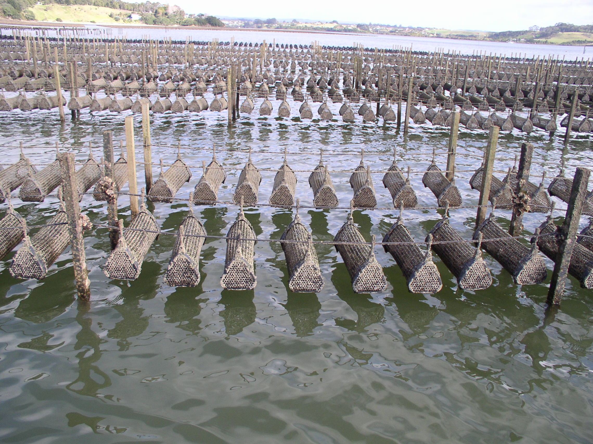 Pacific oyster growing in BST baskets in Orongo Bay, Bay of Islands.