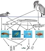 Food web showing the role of macroinvertebrates in the functioning of streams. The arrows indicate what eats what.