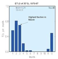 Frequency by month of tropical cyclones progressing south of 35�S from 1970-1997 data. The total number of storms was 81.