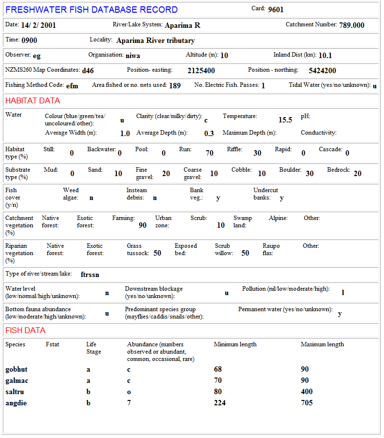 New Zealand Freshwater Fish Database - sample record. Credit: NIWA.