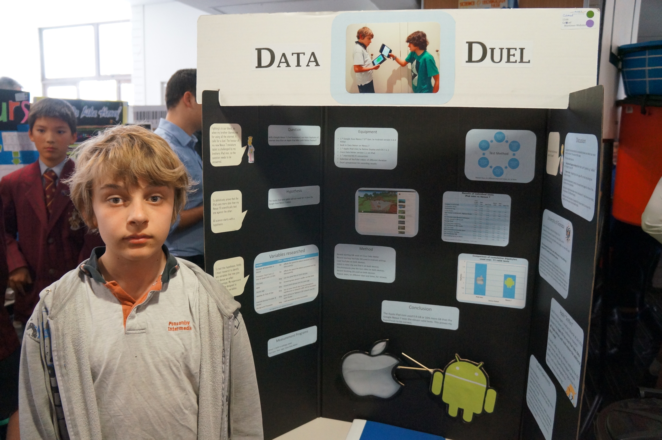 Galahad with his project Data Duel. Galahad tested which device, an ipad mini or a Google Nexus 7, uses less bandwith playing Youtube videos. He found the ipad used more!