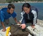 Grace Ormond shows a student a juvenile lobster, or puerulus, taken from the Booth crevice collector. (Photo: Rongomaiwahine Iwi Trust)