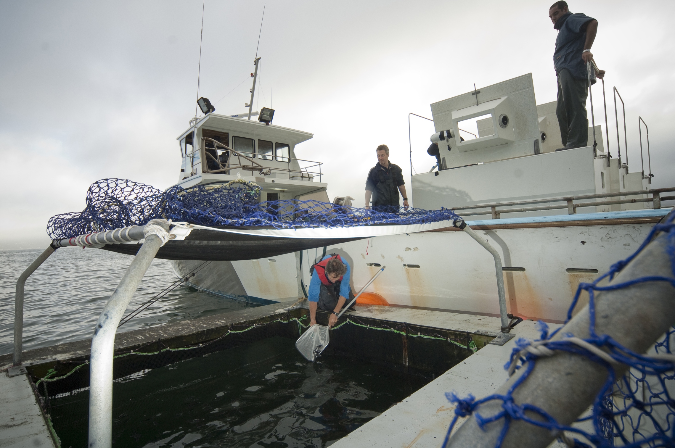 Graeme Moss, Philip Heath and David Mcqueen with Juvenile Hapuku being transferred to the sea cages at Mahanga Bay
