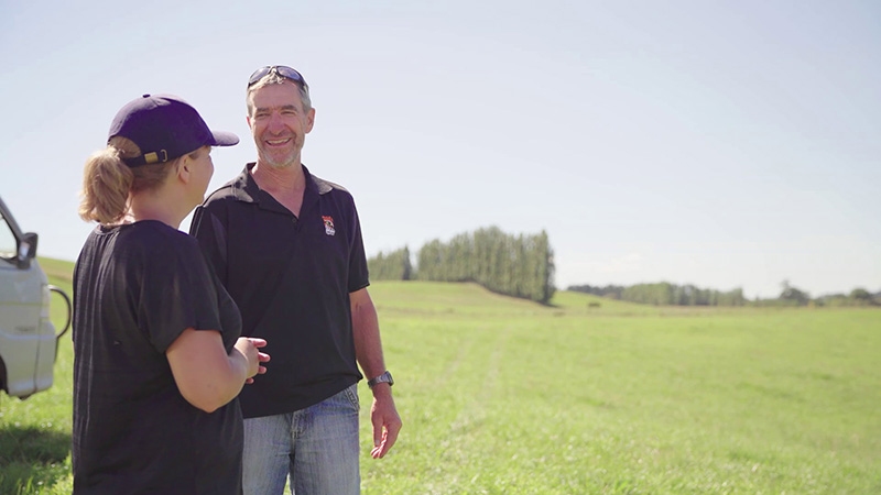 NIWA researcher Fleur Matheson with farmer Grant Wills on his family’s property in the Waikato region.