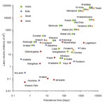 The graph shows residence times and lake capacities and which fish have developed land-locked populations in each lake.