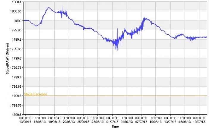 This graphical display shows two abstraction events where water was taken from the lake to make snow. This can only be done when the temperature is low enough for freezing. If the lake level ever drops to the ‘stage decrease’ threshold at 1799.6m ASL, an alarm is generated and text messages are sent to selected NZSki employees to warn that the lake level is down to within 20cm of the consent limit at 1799.4m ASL.
