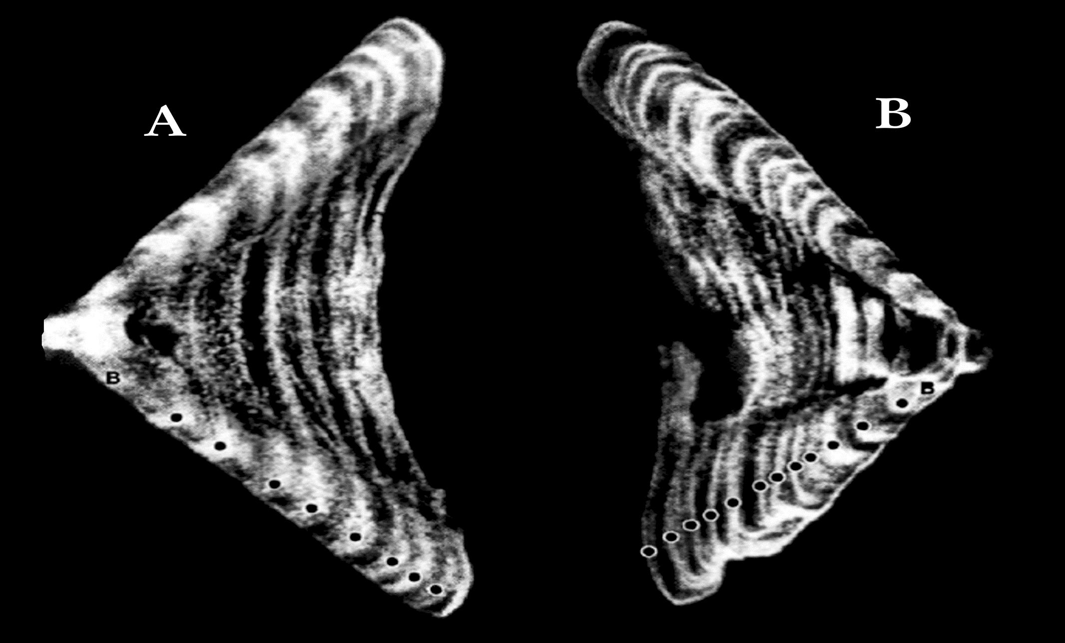 Most skates, sharks and other chondrichthyan species can be aged by viewing annual banding patterns in their vertebrae. This digitally-enhanced x-ray image shows half-vertebral thin sections from (A) a 67cm rough skate (Dipturus nasutus) aged 8 years and (B) a 96cm smooth skate (Dipturus innominatus) aged 12 years. (The small “B” on the x-rays mark the birth band position.) Credit: Caoimhghin Ó Maolagáin