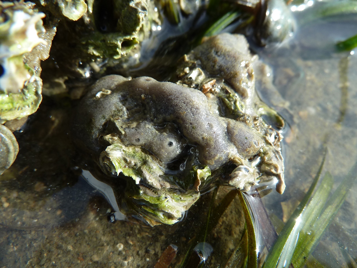 Haliclona venustina is a relatively common intertidal sponge encrusting mudstone, oysters, bryozoans and tubeworms around the Auckland isthmus. [Photo: Nicola Rush, NIWA]