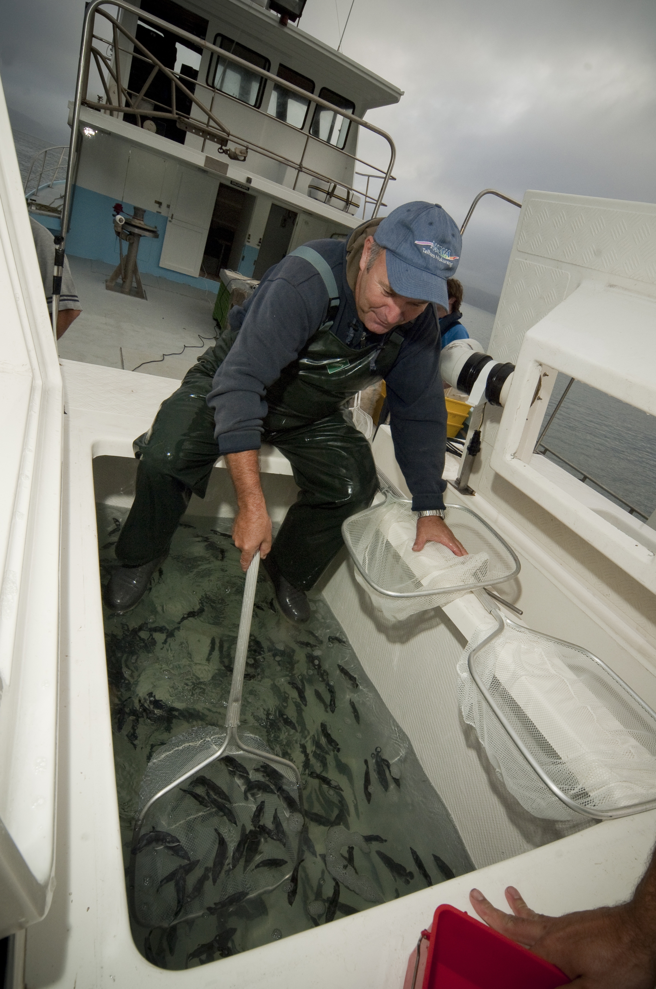 Yann Gublin transferring juvenile Hapuku to the sea cages at Mahanga Bay. Photo taken on 3 February 2011 by Dave Allen, NIWA