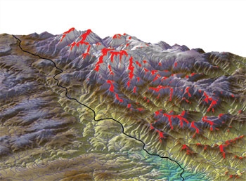High wind speed zones (in red) over hilly terrain.