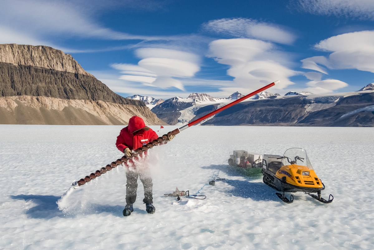 Dr Hinrich Schaefer empties icy drill chips during the drilling of an ice core. Taylor Glacier, Antarctica.