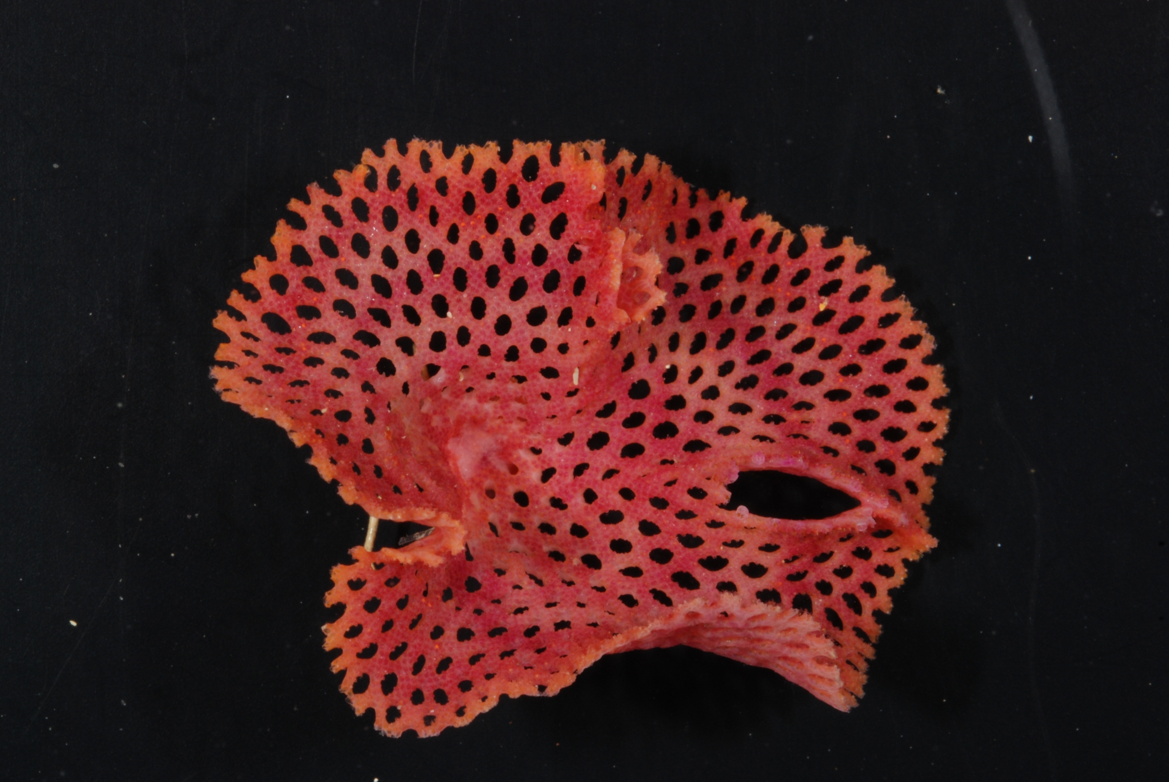 This pink lacey specimen is Hippellozoon novaezelandiae (Waters, 1895) and was collected in the Bay of Islands at 117 m deep. It is in the phylum Bryozoa, aptly sometimes known as lace coral for obvious reasons.