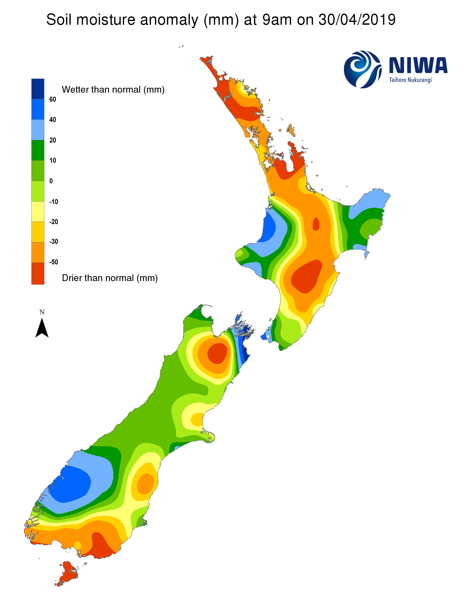 Soil moisture anomaly (mm) at 9am on 30/4/2019