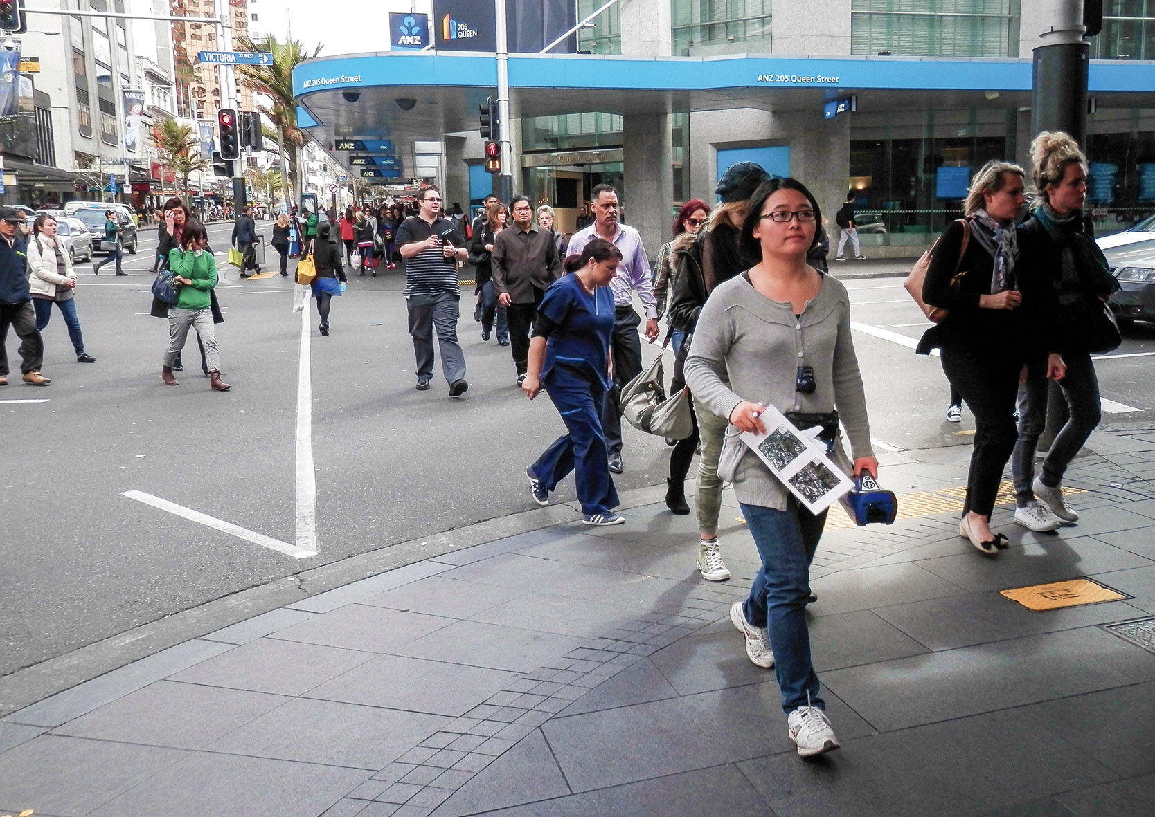 Auckland University student Huimin Lin carrying a “PTrak” particle counter in her left hand, a “Langan” carbon monoxide sensor on her belt, a noise meter pinned to her cardy, and a GPS receiver in her belt. She is shown walking on a specified route in Queen Street. She took this route (Wyndham Street to Wellesley Street and back) every 15 minutes during rush hour, whilst others, similarly equipped, walked other specified routes. She used the notebook to note down her timings, and anything that might impact the measurements – sources of loud noise, dirty vehicles, etc.