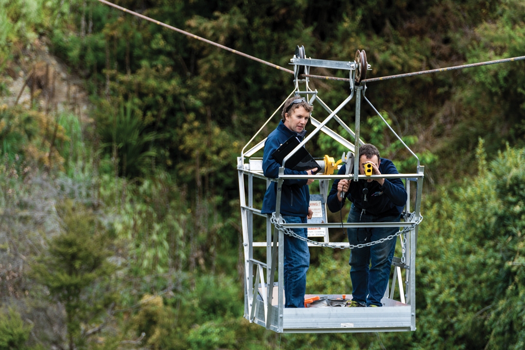 Hanging high above the water, technician Hamish Sutton (right) and his ecohydraulics colleague Dr Hamish Biggs carefully position themselves to measure the flow of the Hurunui River below.