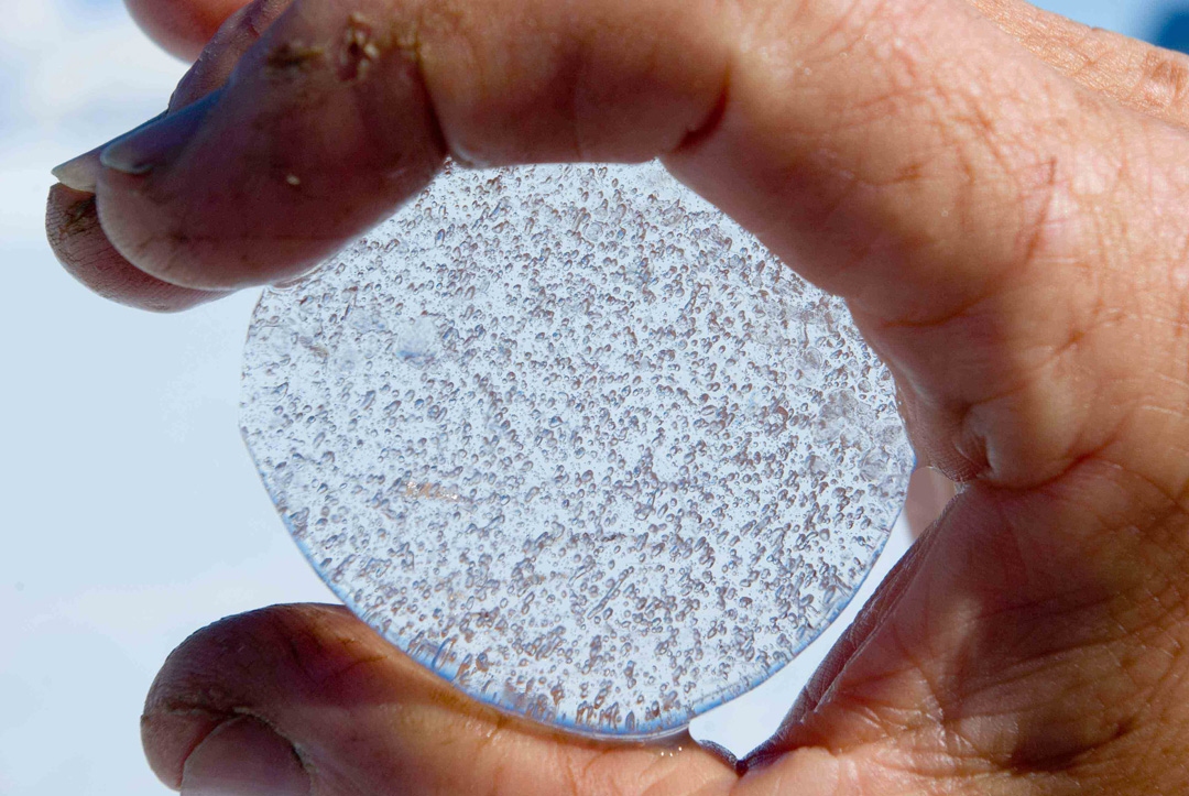 Thin slice of ice core showing the trapped bubbles.