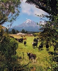 Icons of Taranaki - snow-tipped mountain, subtropical forest, and dairying. Climate normals confirm the reliability of Taranaki's climate for pastoral farming. (Photo: Wendy St George)
