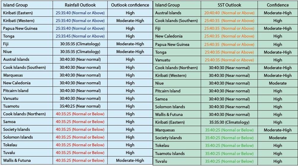 Rainfall and sea surface temperature estimates for Pacific Islands for the next three months are given in the tables below. The tercile probabilities (e.g., 20:30:50) are derived from the averages of several global climate models. They correspond to the odds of the observed rainfall or sea surface temperatures being in the lowest one third of the distribution, the middle one third, or the highest one third of the distribution. For the long term average, it is equally likely (33% chance) that conditions in any of the three terciles will occur. If conditions are climatology, we expect and equal chance of the rainfall being in any tercile.
