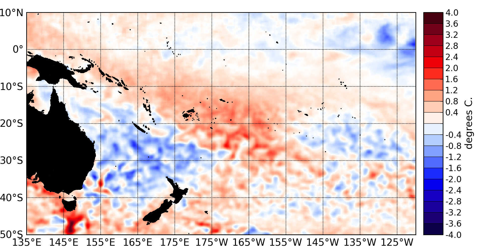 Surface temperature anomalies (ºC) for June 2013, data is from the NOAA OISST Version 2 dataset, available at the NOAA’s Climate Data Center (ftp.cdc.noaa.gov/Datasets/noaa.oisst.v2.highres).