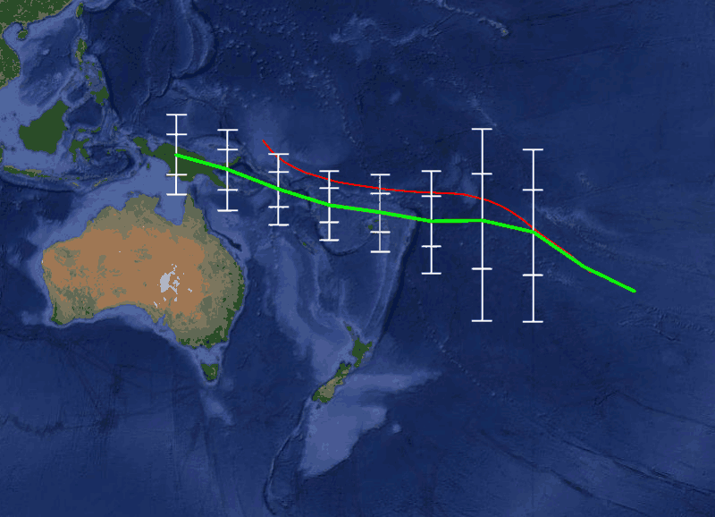 The ensemble of global climate models for rainfall that are used in METPI show an area of higher than normal rainfall associated with the SPCZ position. The green line indicates the average SPCZ position for the forecast period based on the average of 8 climate models. The white vertical bars and ‘whiskers’ indicate the one and two standard deviations between the model projections of the SPCZ position every 5 degrees of longitude.