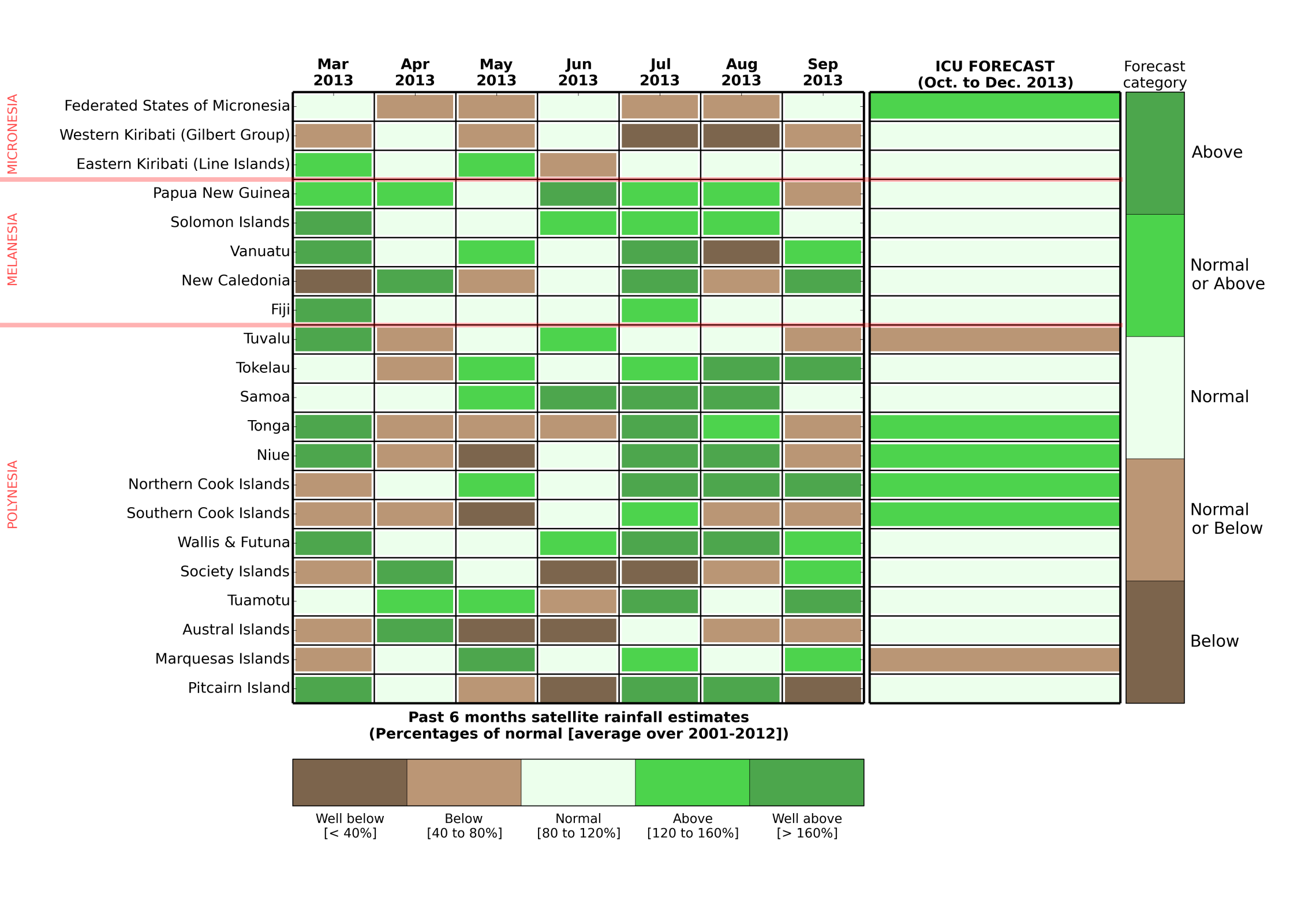 The last six months rainfall anomalies for each Island group alongside the latest ICU rainfall forecast for the October - December 2013 period.