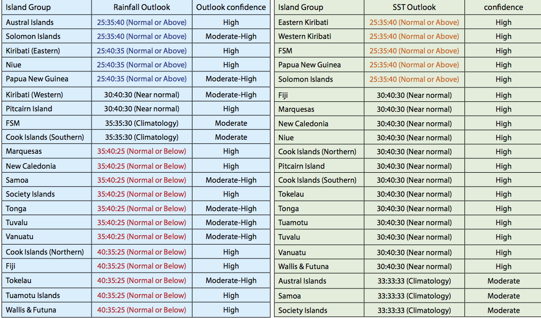 NOTE: Rainfall and sea surface termperature estimates for Pacific Islands for the next three months are given in the tables below. The tercile probabilities (e.g., 20:30:50) are derived from the averages of several global climate models. They correspond to the odds of the observed rainfall or sea surface temperatures being in the lowest one third of the distribution, the middle one third, or the highest one third of the distribution. For the long term average, it is equally likely (33% chance) that conditions in any of the three terciles will occur. *If conditions are climatology, we expect an equal chance of the rainfall being in any tercile.