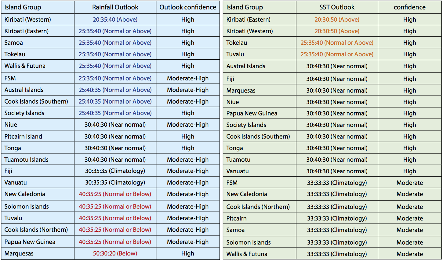 NOTE: Rainfall and sea surface termperature estimates for Pacific Islands for the next three months are given in the tables below. The tercile probabilities (e.g., 20:30:50) are derived from the averages of several global climate models. They correspond to the odds of the observed rainfall or sea surface temperatures being in the lowest one third of the distribution, the middle one third, or the highest one third of the distribution. For the long term average, it is equally likely (33% chance) that conditions in any of the three terciles will occur. *If conditions are climatology, we expect an equal chance of the rainfall being in any tercile.