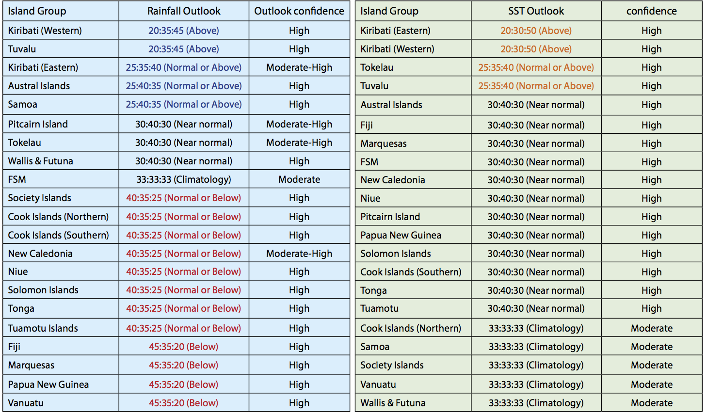NOTE: Rainfall and sea surface termperature estimates for Pacific Islands for the next three months are given in the tables below. The tercile probabilities (e.g., 20:30:50) are derived from the averages of several global climate models. They correspond to the odds of the observed rainfall or sea surface temperatures being in the lowest one third of the distribution, the middle one third, or the highest one third of the distribution. For the long term average, it is equally likely (33% chance) that conditions in any of the three terciles will occur. *If conditions are climatology, we expect an equal chance of the rainfall being in any tercile.