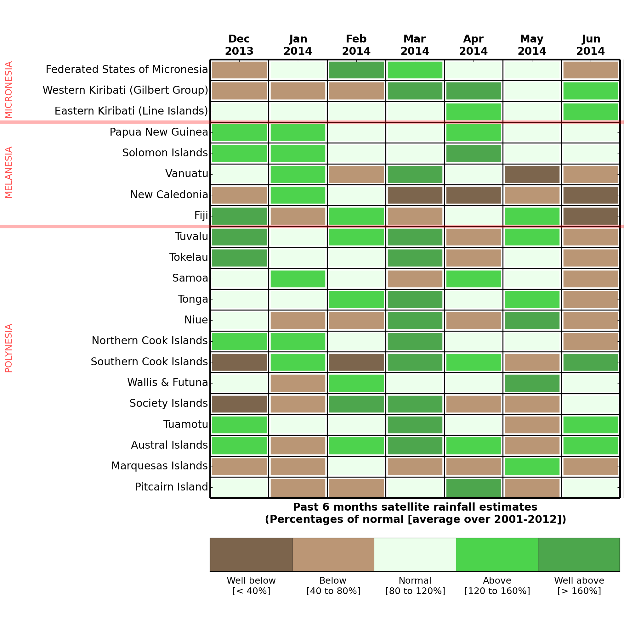 The last six months rainfall anomalies for each Island group alongside the latest ICU rainfall forecast for the July 2014 - September 2014 period.