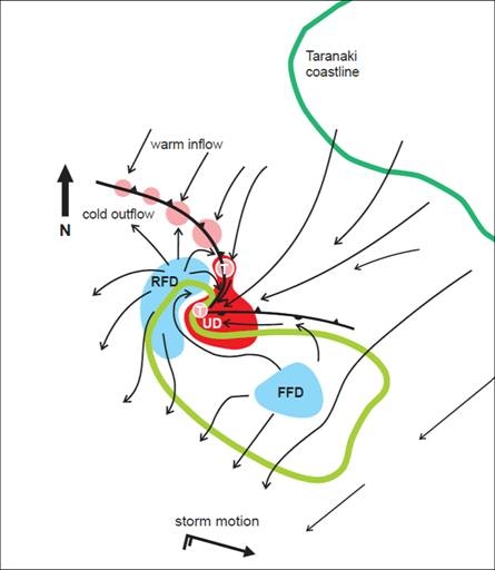 Idealized schematic plan view of a tornadic thunderstorm at low levels. Dark red shaded area shows the position of the main thunderstorm updraft (UD) Light blue shaded areas show the Rear Flank Downdraft (RFD) and Forward Flank Downdraft (FFD). Light-green line shows the probable extent of a radar echo. Black arrows shows the storm-relative flow (i.e. wind vectors with the mean northwesterly storm-motion subtracted). Frontal symbols mark the boundary between the warm inflow and cold outflow - areas of rising motion along the frontal boundary are shaded light-red. The likely location of tornadoes is indicated by the circled Ts.