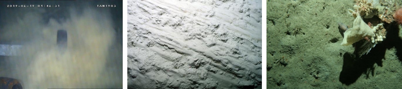 Images from DTIS: sediment plumes, disturbed bottom sediment / mud, and various benthic animals that live in this area on the Chatham Rise – sponges, corals. Evidence of burrows are also seen in the image on the right.