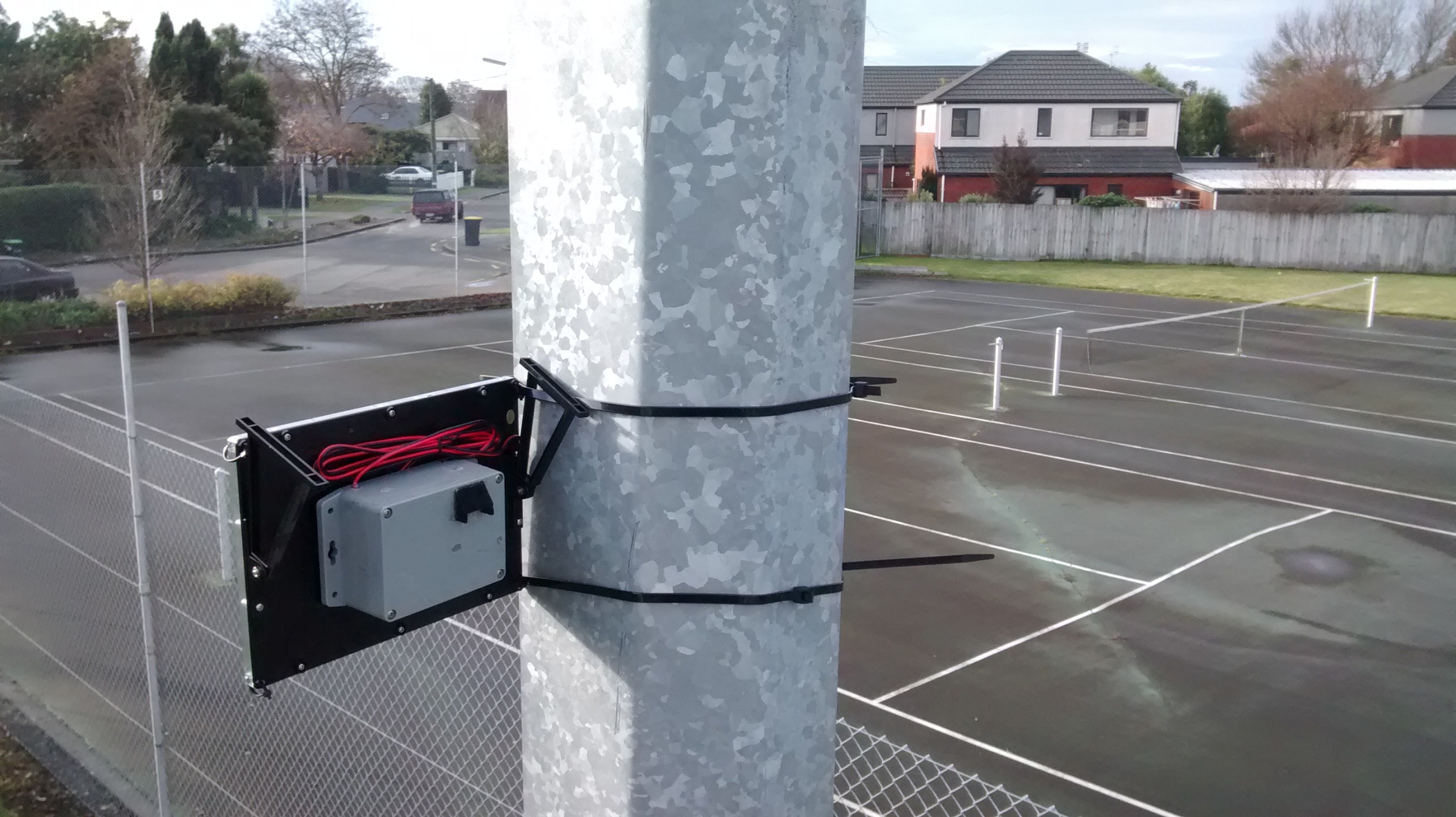 NIWA’s low-cost ODIN air quality sensor package tied to a lamp post in Christchurch.