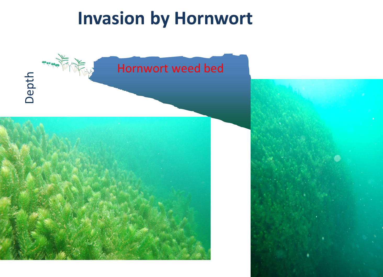 Invasion by hornwort. A dense, closed canopy (up to 7m) chokes waterways and displaces native species. Hornwort has no proper roots, but rather basal stems lodged in the mud - this also results in buoyant rafts or floating mats. Credit: Mary de Winton