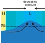 Inverse-barometer effect: mean sea level (MSL) rises in areas of low atmospheric pressure (L) and falls in areas of high pressure (H).