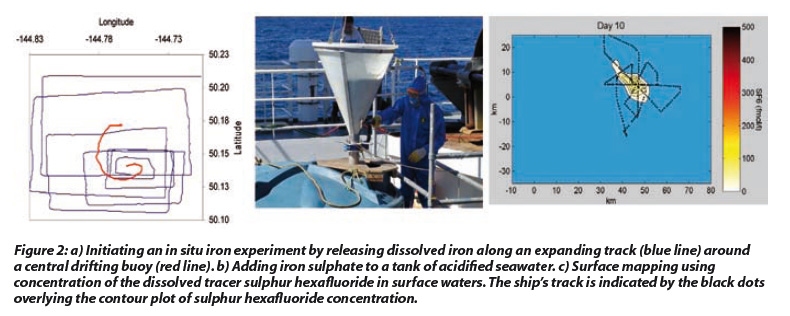 a central drifting buoy (red line). b) Adding iron sulphate to a tank of acidified seawater. c) Surface mapping using