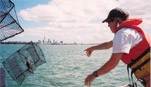 Isla Fitridge throwing crab traps overboard.