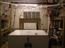 Inside the Antarctic-simulation lab – at rear, samples are drawn through tubes, and ported through four 8-way distribution valves. In the box in the foreground, the samples are sequentially analysed in a spectrometer and data sent to the computer. (Vonda Cummings)