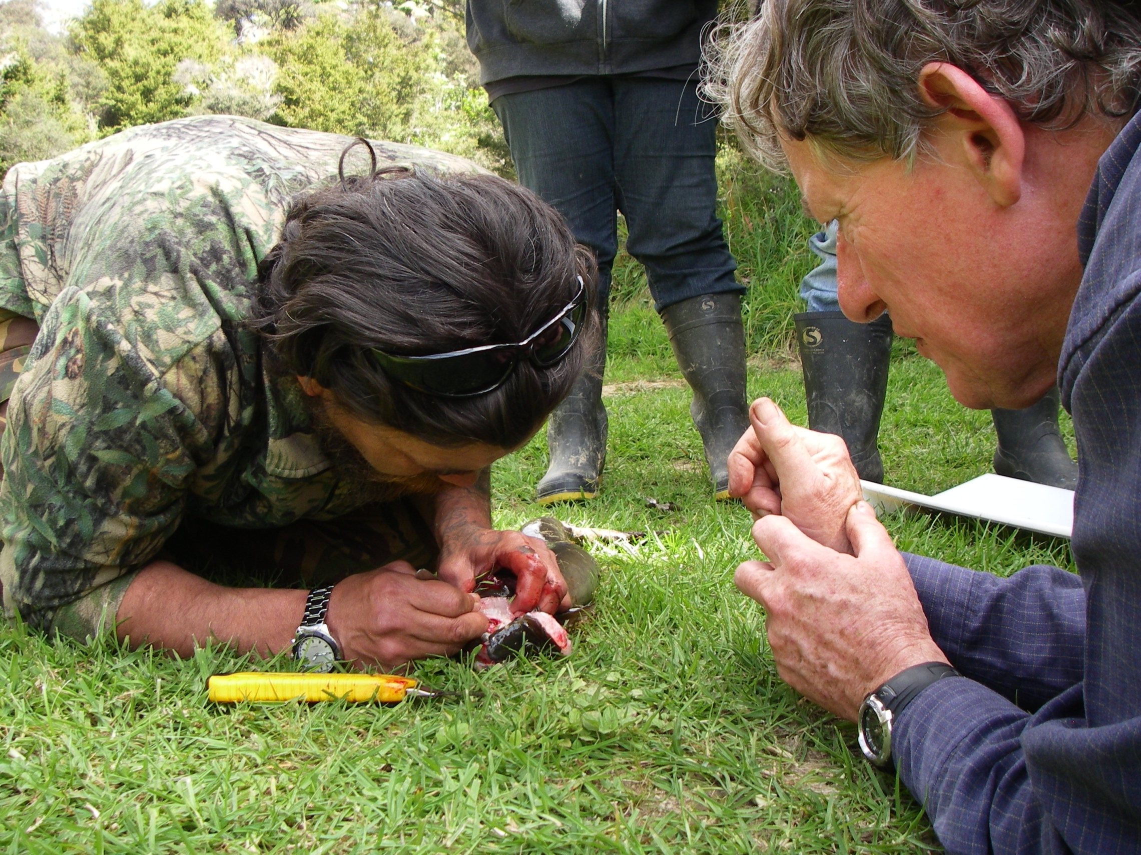 Mike Zachan and Jacques Boubée removing the otoliths from an eel. Credit: Iri Morgan.