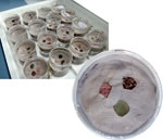 Jars containing Mesophyllum sp. (at top right in the close-up), Phymatolithon repandum, and bare pebbles imbedded in modelling clay. About 50 paua larvae were placed in each of the jars. (Photos: Alan Blacklock)