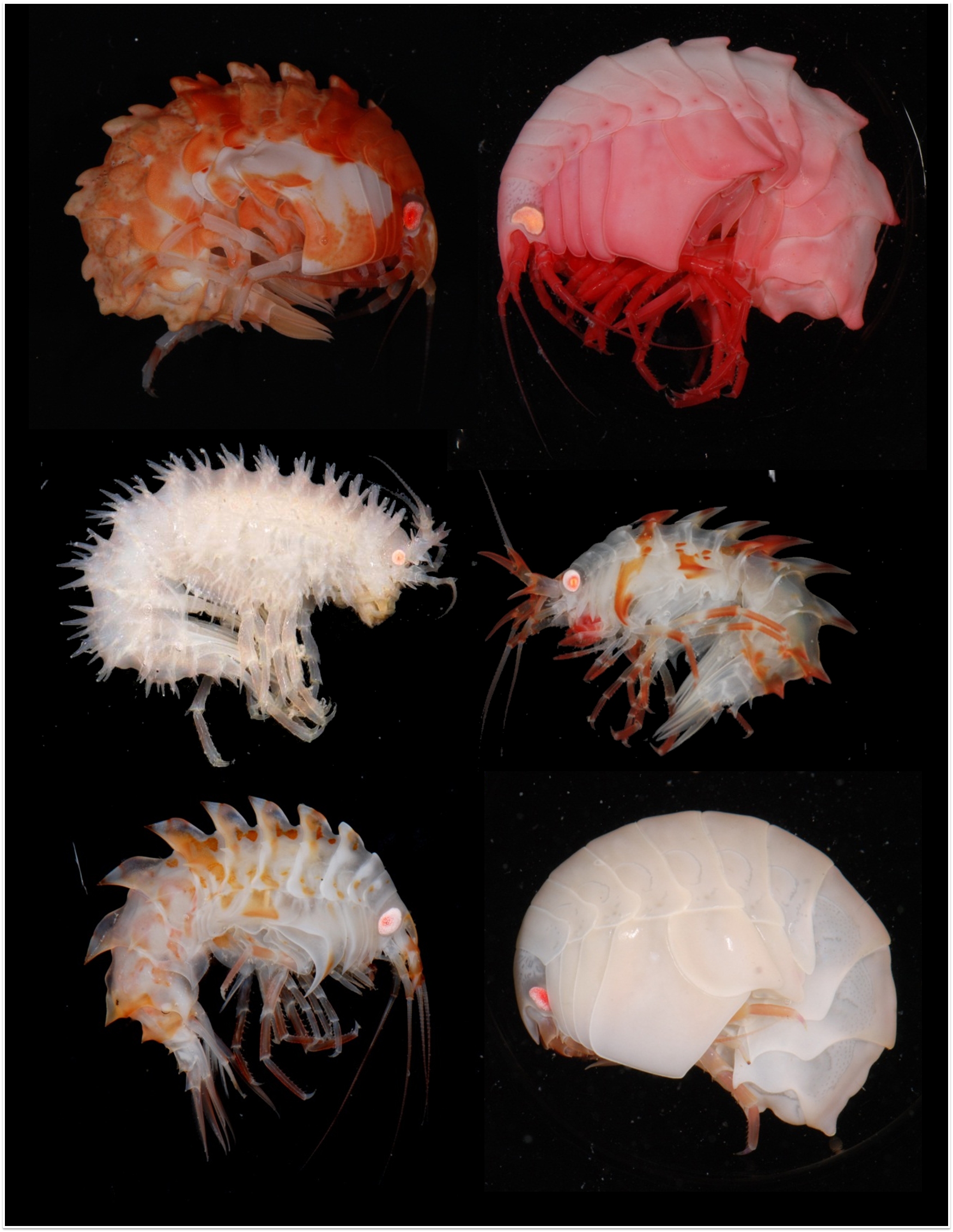 Jewels of the deep - Amphipods between 1-3 cm in size collected in the Ross Sea and photographed live to showcase their amazing colours. Top left: Epimeria rimicarinata; Top right: E. larsi; Middle row: E. schiaparelli (named after the photographer); Bottom right: Epimeria robusta. The bottom left image is of a closely related genus, Echiniphimedia, aptly named the ‘prickly’ amphipod. Credit: Stefano Schiaparelli (University5 of Genoa) and David Bowden (NIWA)/ IPY CAML voyage TAN0802.