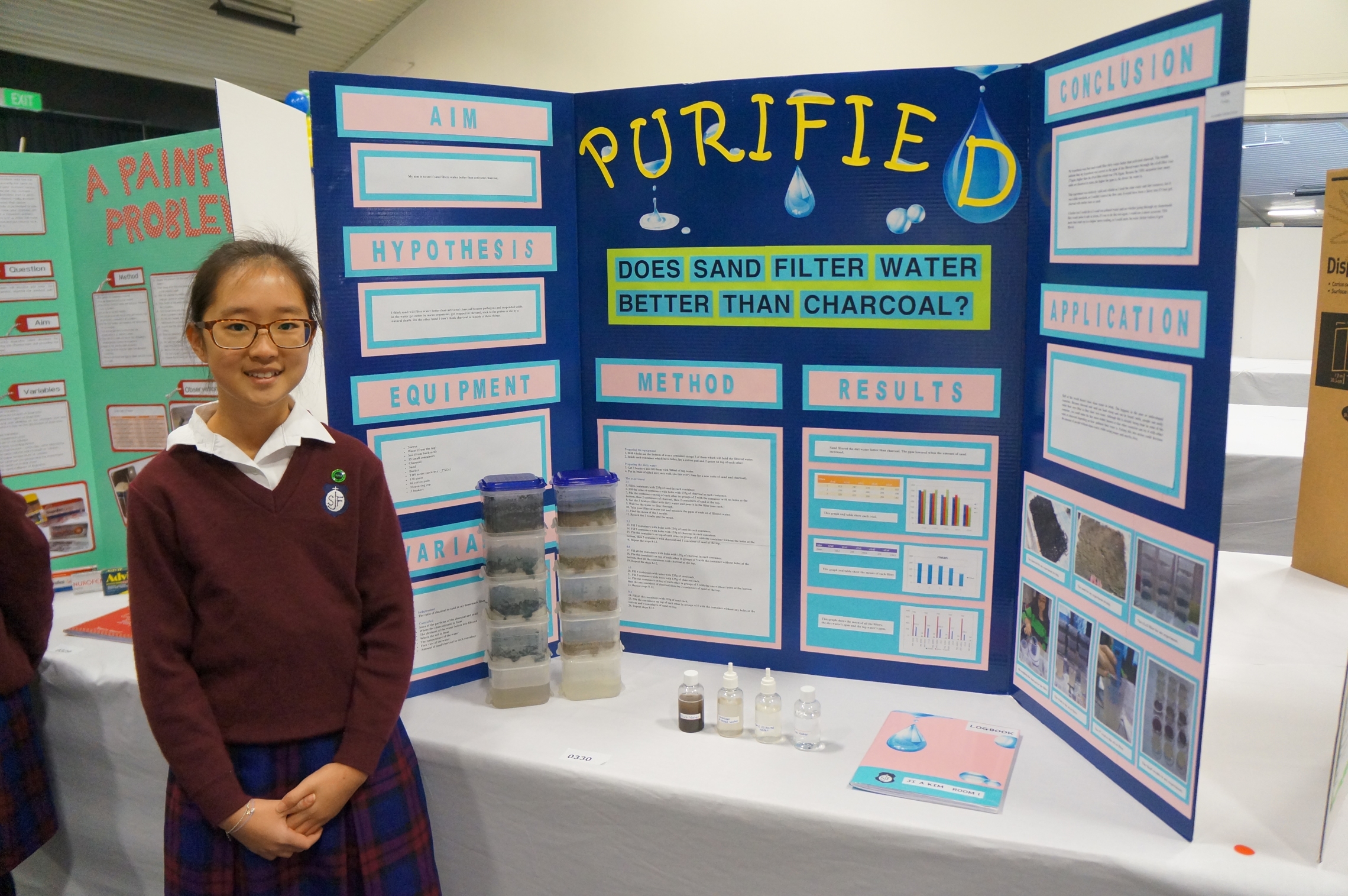 Ji A Kim with her project 'Purified' - testing whether sand filters water better than charcoal.