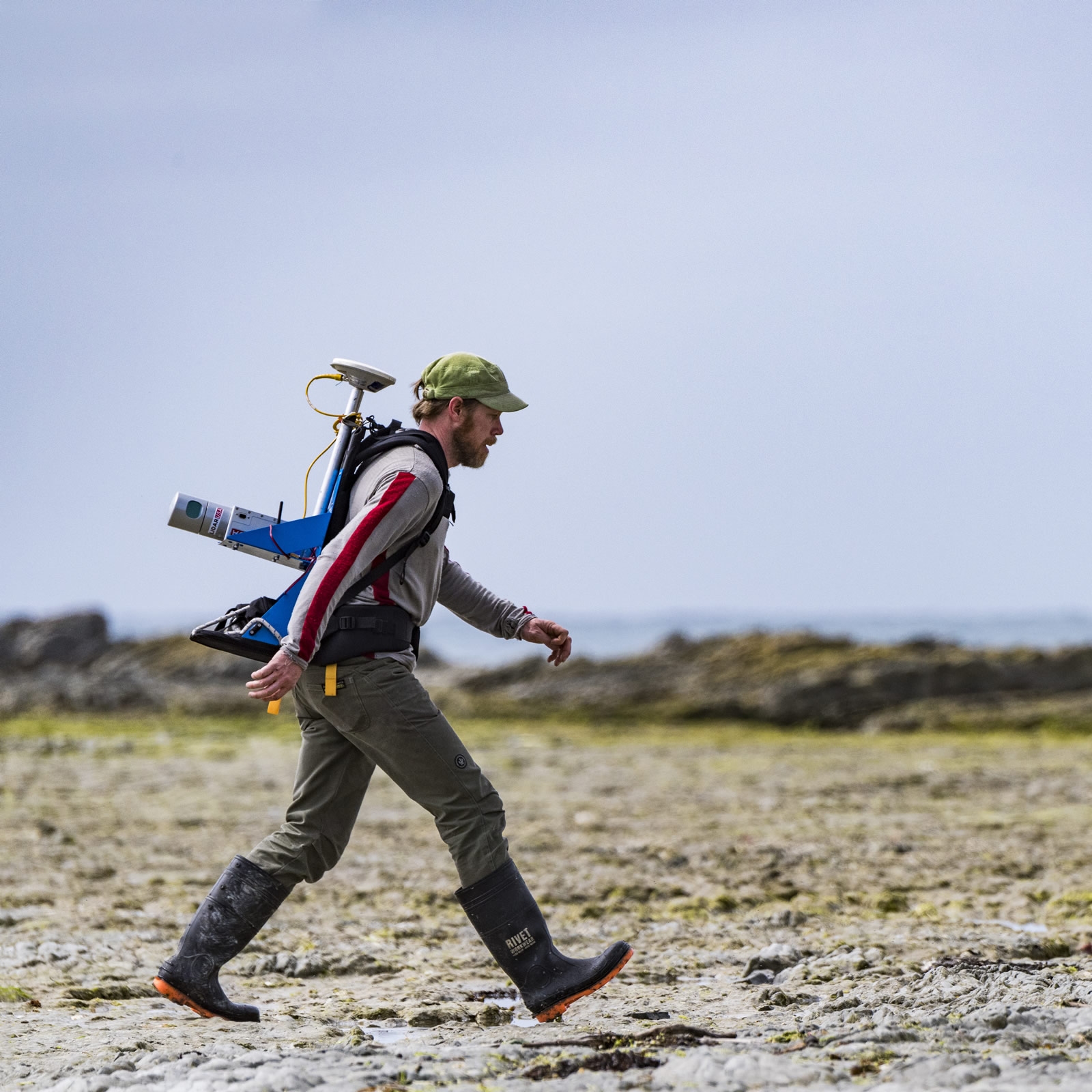 GIS Technician Jochen Bind with his trusty gumboots, a purposeful stride, and 'Snoopy' on his back (aka NIWA's Scanlook 2.0 mobile mapping LiDAR system).