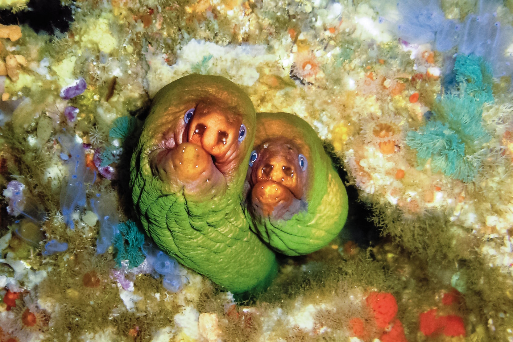 That's amore. It's a tight squeeze for these yellow moray eels (Gymnothorax prasinus), peering from their crevice home in an underwater cliff at the Mokohinau Islands in the Hauraki Gulf. They seem decidely unimpressed with the disturbance in their neighbourhood.