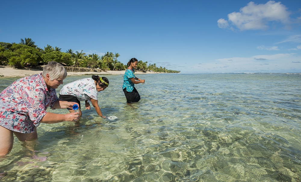 NIWA scientist Julie Hall with two Kiribati government Environmental Health officers sampling ocean side water at Tangaru Hospital, South Tarawa.
