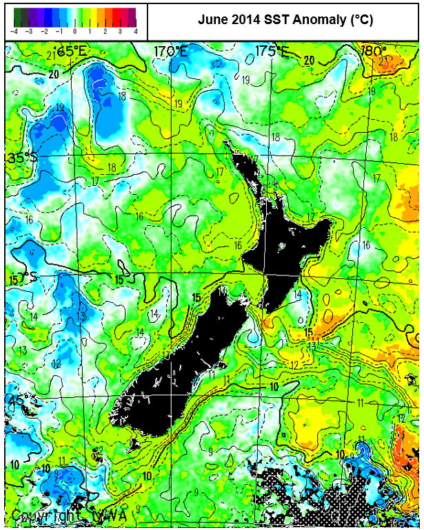 Differences from normal June surface temperatures in the seas around New Zealand.